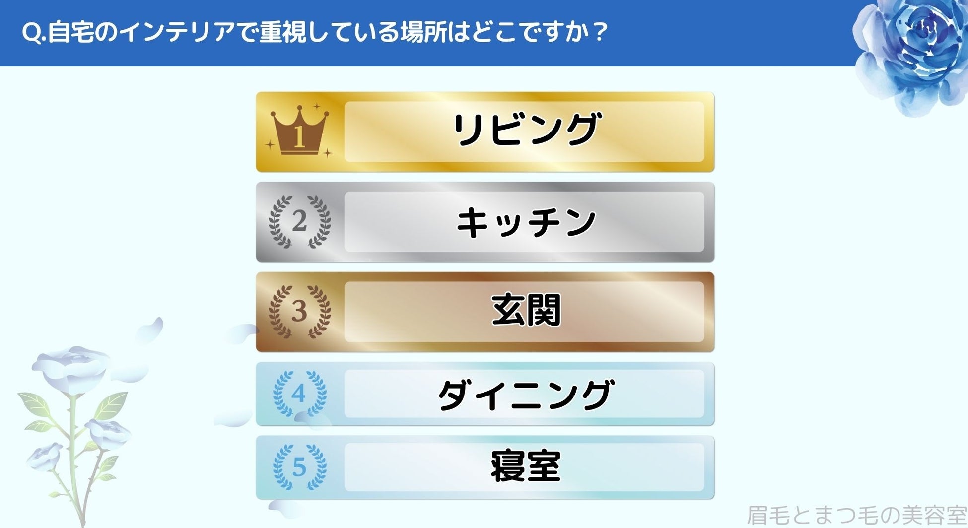 自宅のインテリアで重視している場所をお聞きしたところ「1位>リビング」、「2位>キッチン」、「3位>玄関」、「4位>ダイニング」、「5位>寝室」という結果になりました。