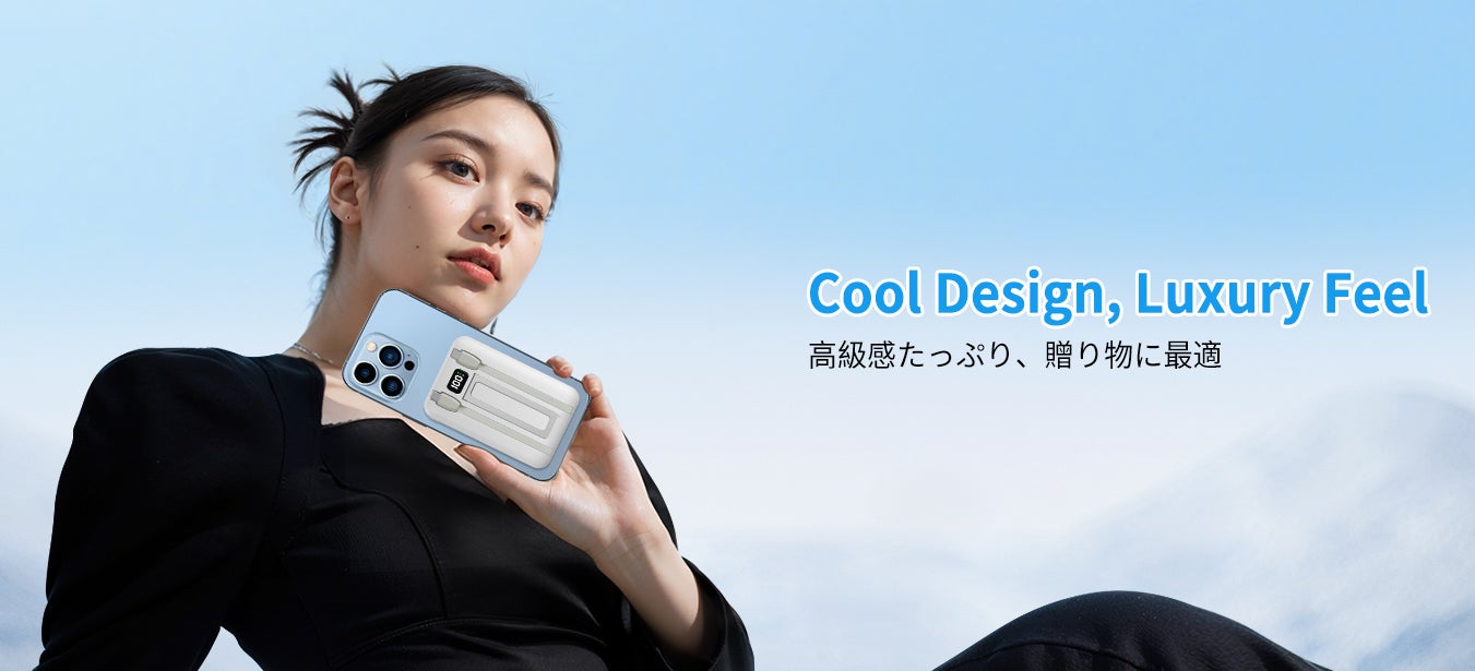 内蔵Type-CとLightningケーブル、さらに無線充電も可能。LEDディスプレイでバッテリー残量を確認し、スタンド付きで動画視聴も快適。薄型軽量設計で、持ち運びも簡単です。