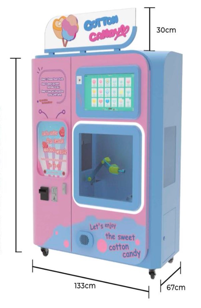 「次世代型わたあめ自販機」は、ボタン一つでふわふわの美味しいわたあめをその場で自動調理して提供する革新的な自販機です。お子様から大人まで、誰もが手軽にわたあめ体験を楽しめることを目指し開発されました。