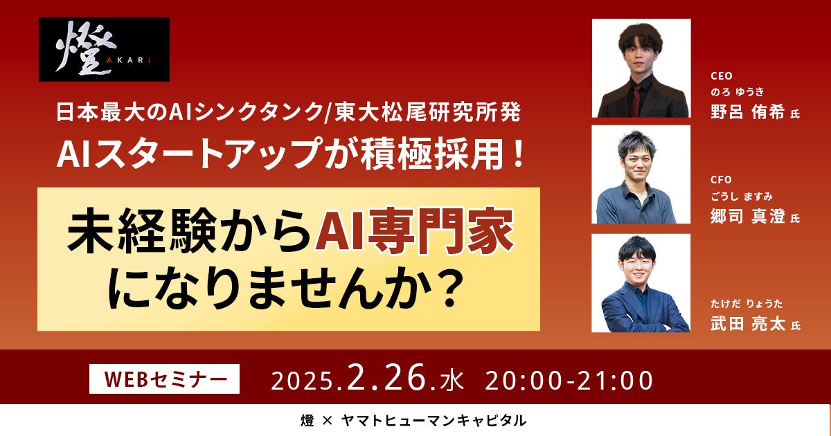 本ウェビナーでは、燈株式会社が描くAI分野での成長戦略や、実際のプロジェクト事例を交えたAI導入の成功事例、さらにはスタートアップで活躍できる人材に求められるスキルやマインドセットについても深掘りします。AIを活用したビジネスの未来を形作る燈株式会社の取り組みと、これからのキャリアに活かせる知見を、ぜひご覧ください。