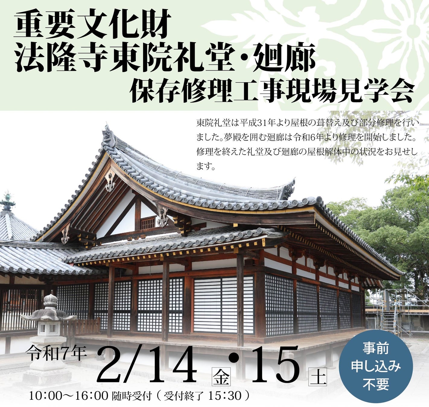 2月14日(金)、15日(土)10:00~16:00(最終受付15:30)に、重要文化財 法隆寺東院礼堂・廻廊の修理工事現場見学会を開催します。