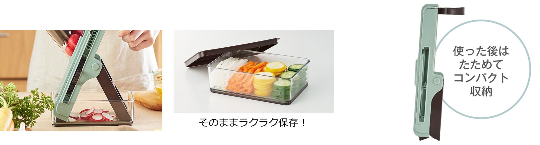 容器の中でスライスしてそのまま保存できる保存容器が付属しています。まとめてスライスした野菜を保存しておけば、毎日のお料理がもっと時短に!使った後はたたんでコンパクトに収納できます。