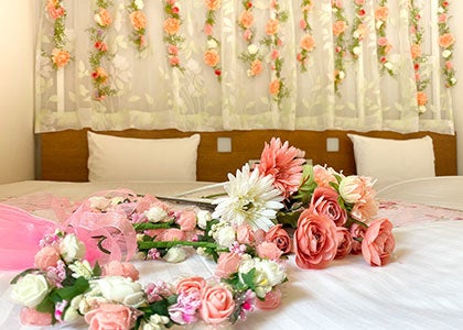 今回のコラボレーションの特徴は、karendoがプロデュースしたコンセプトルーム「フラワーガーデンルーム」です。新宿ワシントンホテルでは女性専用のレディースルーム、横浜桜木町ワシントンホテルではみなとみらいの景色が望める海側のファミリールームがキラキラなお部屋へと変わります。造花などを使って客室内をティーパーティー風に装飾し、karendoの看板商品の1つである入浴用ソープフラワーが好きなだけ使えるなど、お花に囲まれた空間を演出しました。写真撮影にぴったりな花かんむりやプロップスなどの小道具もご用意。ご友人やご家族と、笑顔の花を咲かせてお過ごしください。