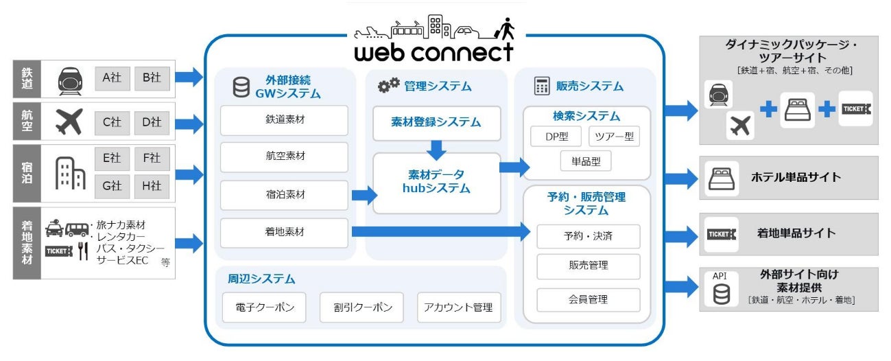 webコネクトは、必要な機能を必要な範囲で利用可能なSaaS型プロダクトです。商品のオンライン販売に求められる素材登録(造成)、検索、予約、電子クーポン、外部接続ゲートウェイといった機能群をモジュール化。国内・海外の多種多様な素材提供会社の素材をコネクトし、動的な商品登録(造成)・商品検索・商品流通・販売を、柔軟かつスピーディに実現します。