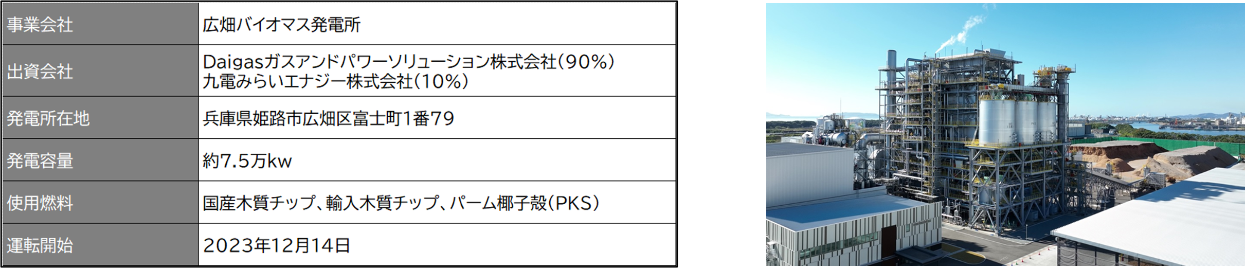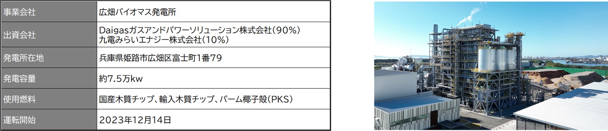 本発電所は、Daigasグループにとって初めて開発当初から主体的役割を担った初めての発電所で、バイオマス発電所としては国内最大級となる発電容量(約7.5万kW)と高い発電効率を実現しています。
