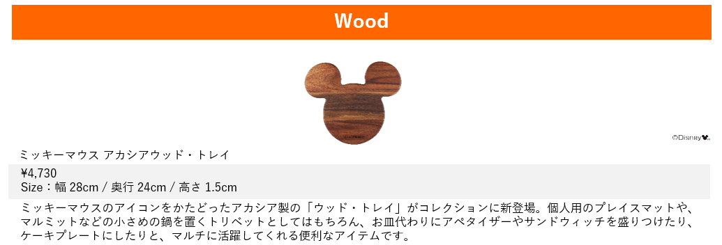 ミッキーマウスのアイコンで陽気なミッキーマウスを想起させる、親しみやすくユーモラスなデザインに仕上げました。2022年春夏のコレクションでは赤と黒だったキーカラーを、今回のコレクションでは白と黒に刷新。さらにミッキーマウスのアイコンをかたどった「ミニ・ディッシュ」は赤、白、緑のホリデーカラーの3色セットで揃え、温もりのある冬の食卓を演出します。そして今回は鋳物ホーローウェアやストーンウェア以外に、ミッキーマウスのアイコンをかたどったアカシア製のおしゃれな「ウッド・トレイ」も登場。好きなカラーとアイテムを自由に組み合わせて、あなただけのミッキーマウス アレンジをお楽しみください。