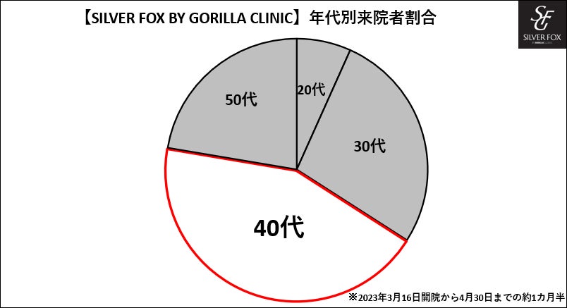 私ども『ゴリラクリニック』(医療法人社団十二会・総院長 稲見文彦)がプロデュースする【男性専門のエイジングケアクリニック『SILVER FOX BY GORILLA CLINIC』(一般社団法人大猩会・院長 太田博之医師)】の場合、2023年3月16日の開院から4月末までの約1カ月半で来院された男性患者さまの多くは40代男性が圧倒的に多く、全体の4割以上(44.6%)を占め、40代以上に至っては、7割(66.0%)に至ります(円グラフを参照)。