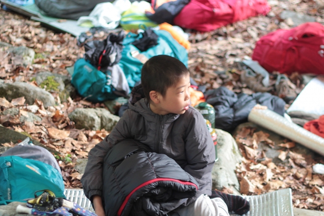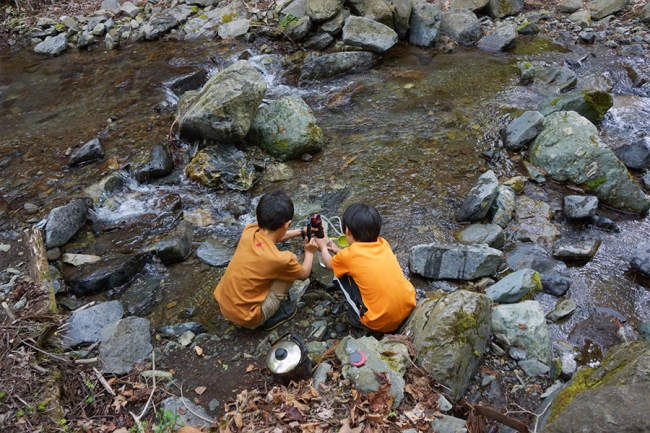 清らかな沢水を煮沸して飲み水をつくり、森で拾い集めた木々で火を熾し、暖をとり煮炊きします。夜は夜露をしのぐタープを張ってビバーク(野営)をします。