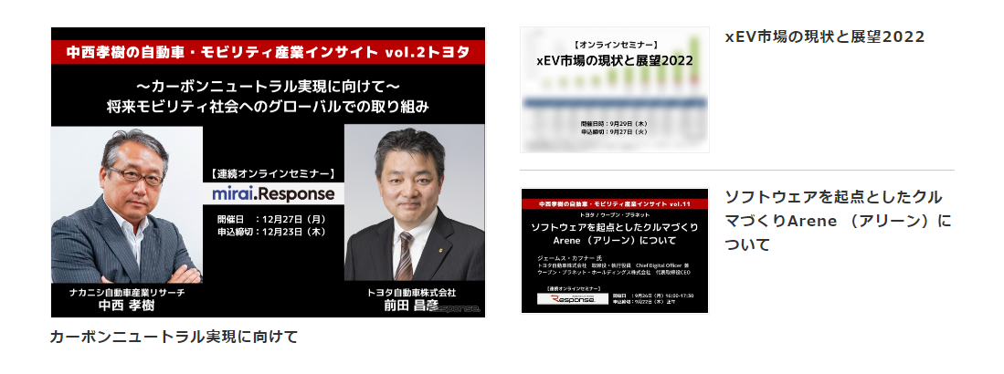 「脱炭素社会のモビリティ戦略」「コネクテッドカーのサイバーセキュリティ」「今のインド」「 BYD Auto Japanの戦略」など自動車業界のキーマンを招いたオンラインセミナーを毎月数回開催。EVの基礎からビジネスを30分で一挙に習得できる「EVリスキリング講座 2023」も提供開始。