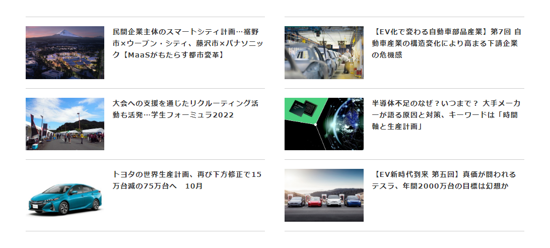 CASE、MaaSの最新ニュースや「自動車業界株価ウォッチ」「人事情報」なども。自動車業界の最新報道に加え、業界を深掘りする連載や解説記事も配信。