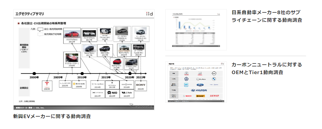 「新興EVメーカー調査」「世界のモビリティトレンド将来予測2030」「国内外主要OEMの電動化、シェアリングサービスの調査」など自動車産業の各分野を整理・分析した調査レポートを提供。