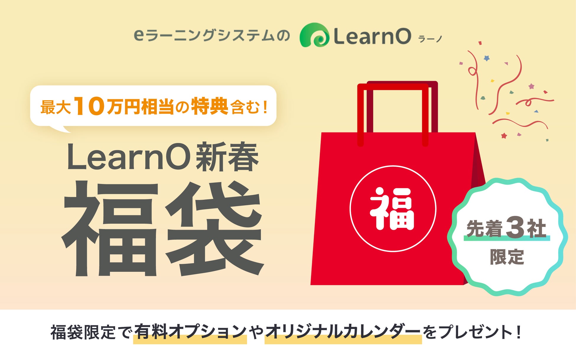 この度、LearnOにちなんだ新春福袋プレゼントキャンペーンを開催いたします。2024年3月末までに、LearnOを新規(※)にご契約いただいたお客様先着3社を対象に、LearnO新春福袋をプレゼントいたします。