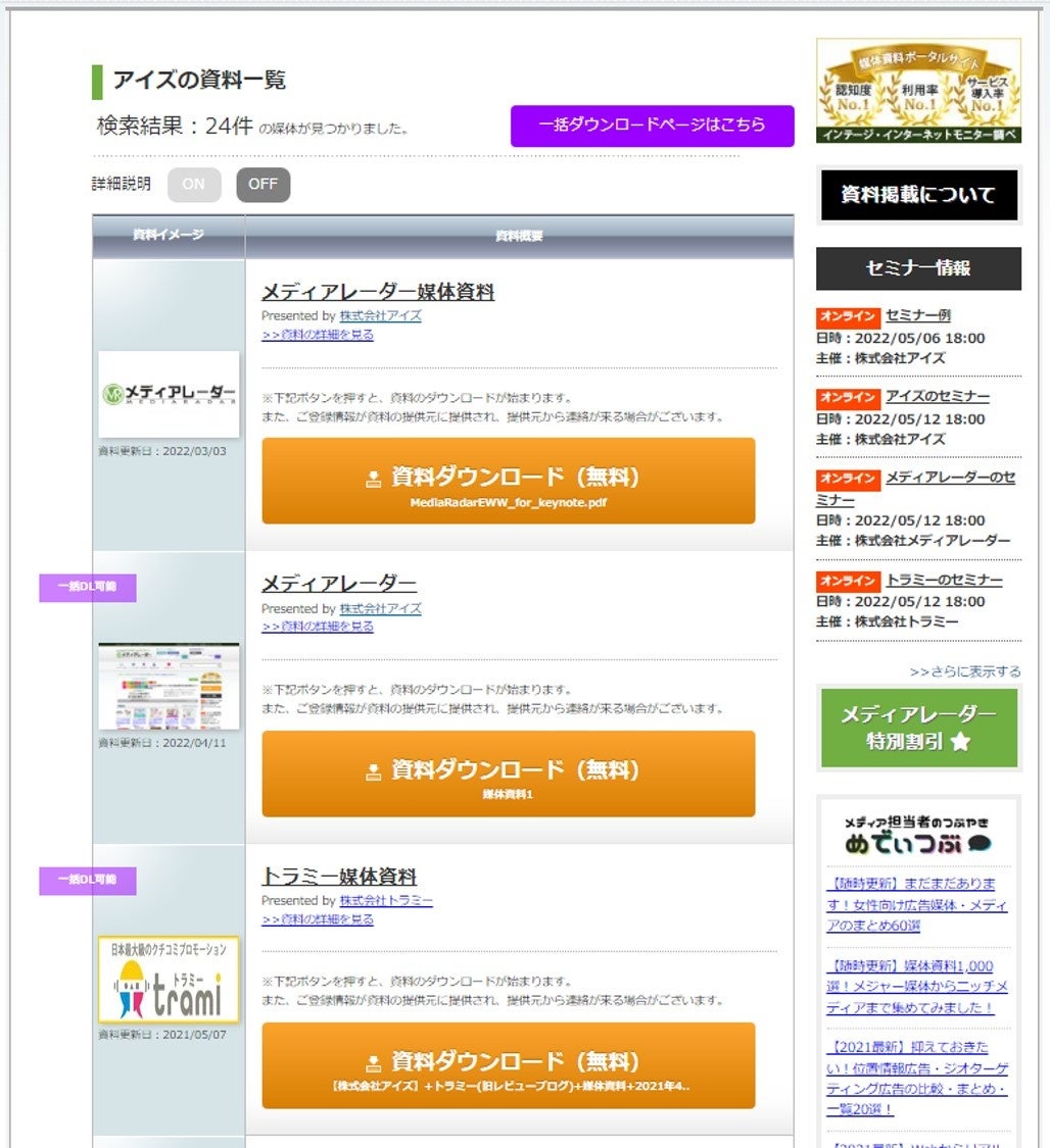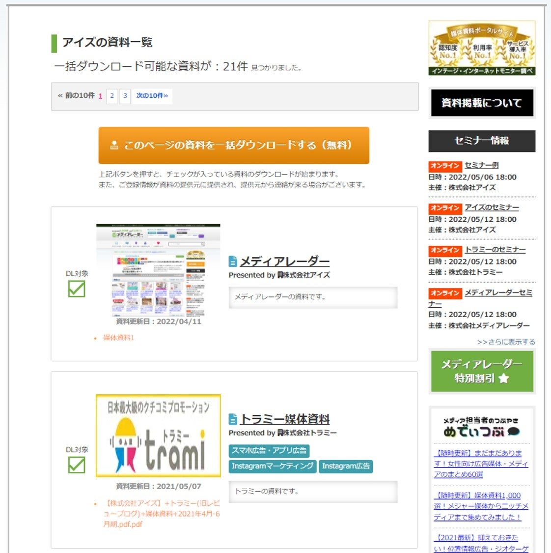 株式会社アイズ(所在地:東京都渋谷区、代表取締役社長:福島範幸)が運営する媒体資料ポータルサイト「メディアレーダー」(https://media-radar.jp/)は、平素より提携企業様・メディアレーダー会員様よりご要望をいただいていた「一括ダウンロード機能」のβテストの実施を決定いたしました。