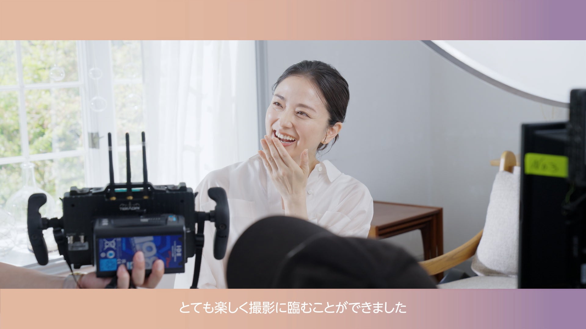 今回は自然光が眩しく差し込む一軒家のスタジオでの撮影となりました。中越さんの明るく柔らかなお人柄が場を和ませてくれたこともあり、終始穏やかな空気の中で撮影が進行しました。監督と丁寧に話し合いを重ね、シーツを伸ばすシーンや頬にクリームを塗る細かな仕草など、中越さんの自然な動きに監督も思わず笑顔に。特に注目していただきたいのが中越さんの決め台詞、「よくばりたいから」。監督による細かなオーダーに真剣に向き合いながら、何度もセリフに挑戦していただきました。その結果、ナチュラルな雰囲気の中で、中越さんの柔らかな美しさが溢れる印象的なカットとなっております。撮影の合間にはスタッフと楽しそうに談笑する中越さんの姿も見られ、現場も終始笑顔に包まれました。