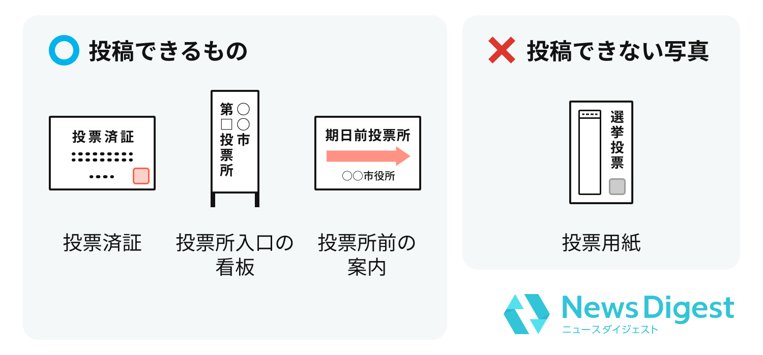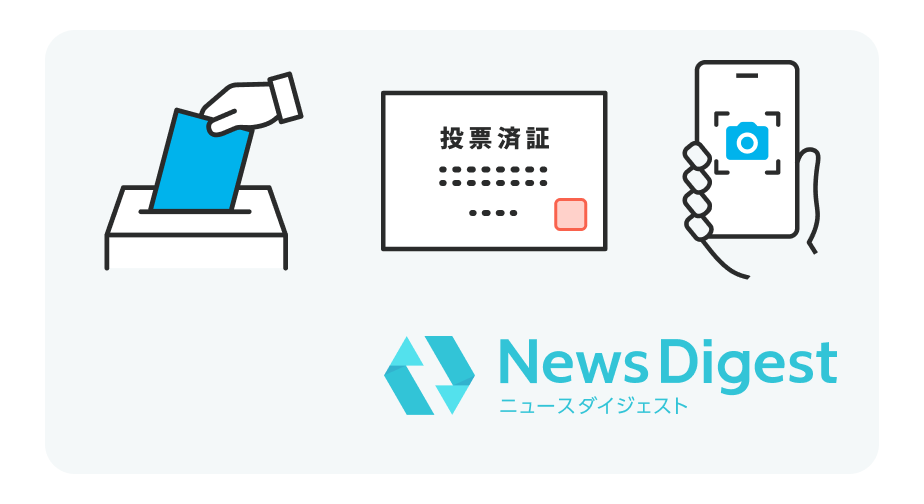 - 参加方法:NewsDigestアプリ(無料) をダウンロード→参院選の投票に行く→投票所前の写真か投票済証の写真を投稿し、アンケートに回答する