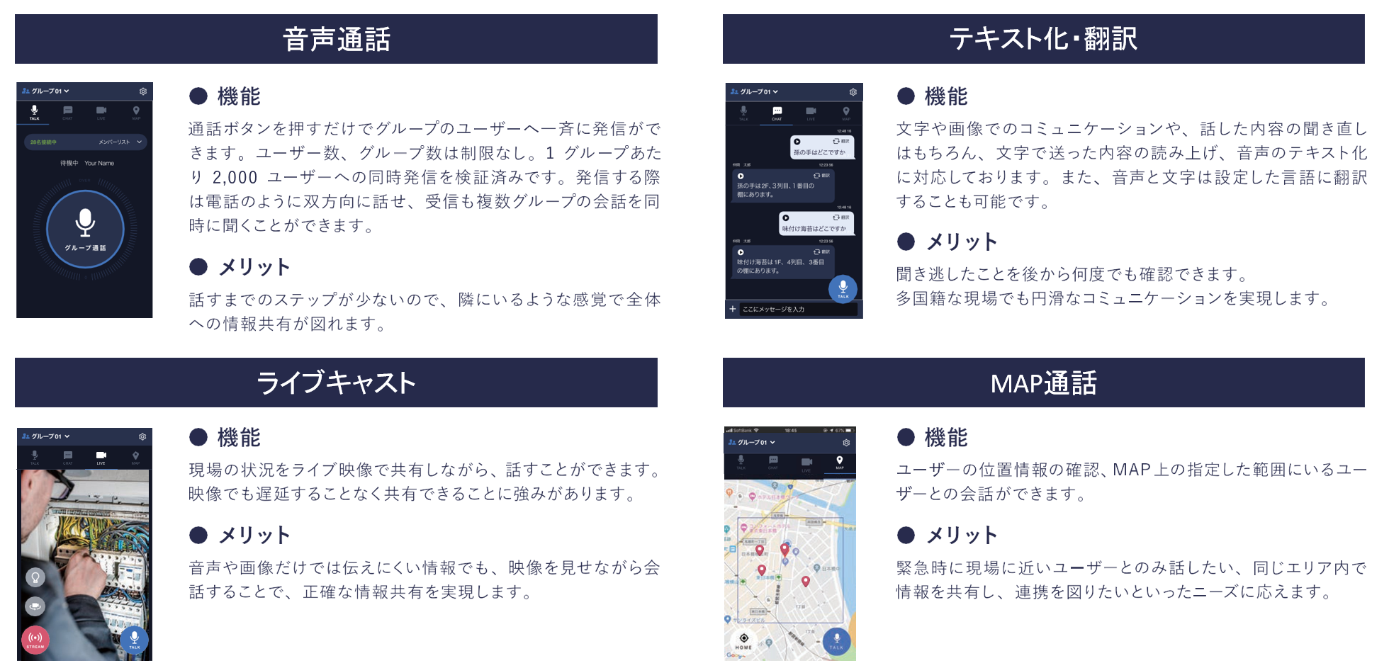 Buddycomは、デスクレスワーカーをつなげるライブコミュニケーションプラットフォームとして、インターネット通信網(4G、5G、Wi-Fi)を利用して、スマートフォンやタブレットにアプリをインストールすることで、トランシーバーや無線機のように複数人と同時コミュニケーションを可能にするサービスです。音声、テキストチャット、動画、位置情報(IoT)に加え、AIを利用したデジタルアシスタントでのコミュニケーションが可能です。
