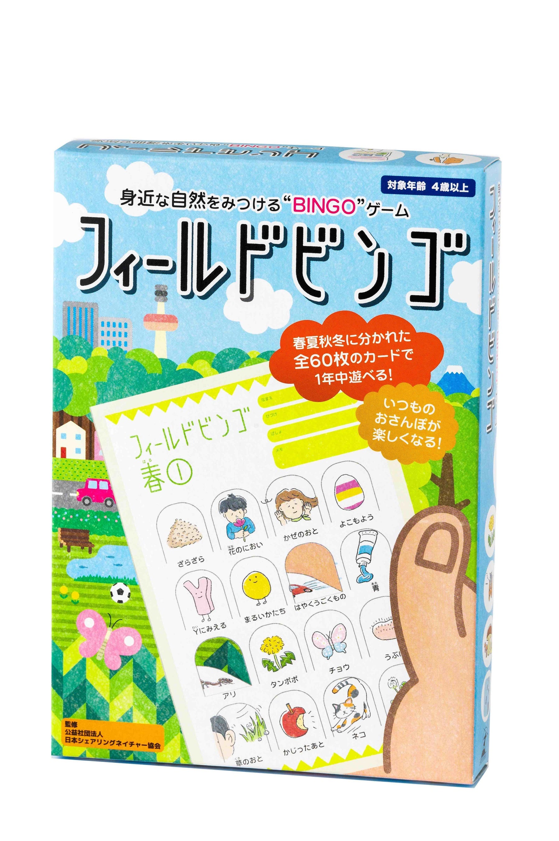 カードに描かれた自然のものをさがすゲームです。探すものは「やわらかいもの」や「かぜのおと」、「いいにおい」など五感を使ってみつけるものです。自然を「触る」、自然のにおいを「嗅ぐ」、自然の音を「聴く」など、自然体験を日々の生活に取り入れたい方にもおススメです!