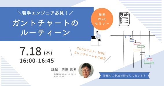 株式会社システムインテグレータ(本社:さいたま市中央区、代表取締役社長:引屋敷 智、東証スタンダード:証券コード3826)は、「若手エンジニア必見!ガントチャートのルーティーン」と題した無料ウェビナーを、2024年7月18日(木)に開催することをお知らせします。