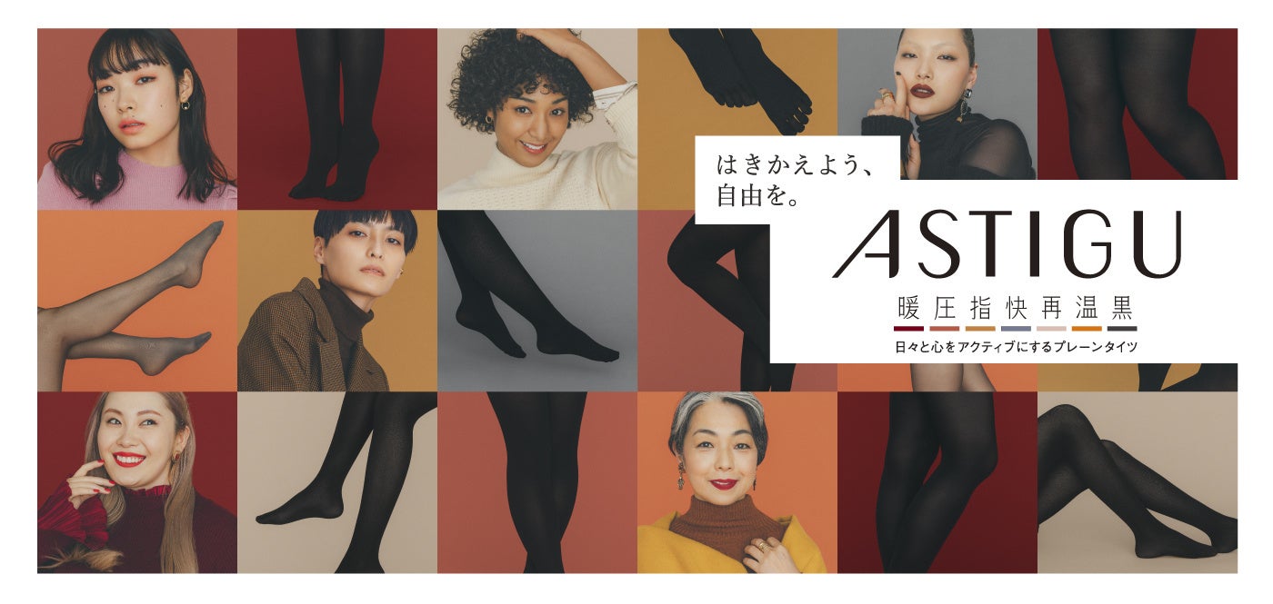 アスティーグは、ストッキング・タイツを求める全ての方々にはいていただけるよう、サイズ・カラーを豊富に取り揃え、アスティーグのアイデンティティである漢字一文字の商品名はそのままに、今の生活者が必要とするストッキング12種、タイツ6種のラインアップ(秋冬シーズン)を展開しております。