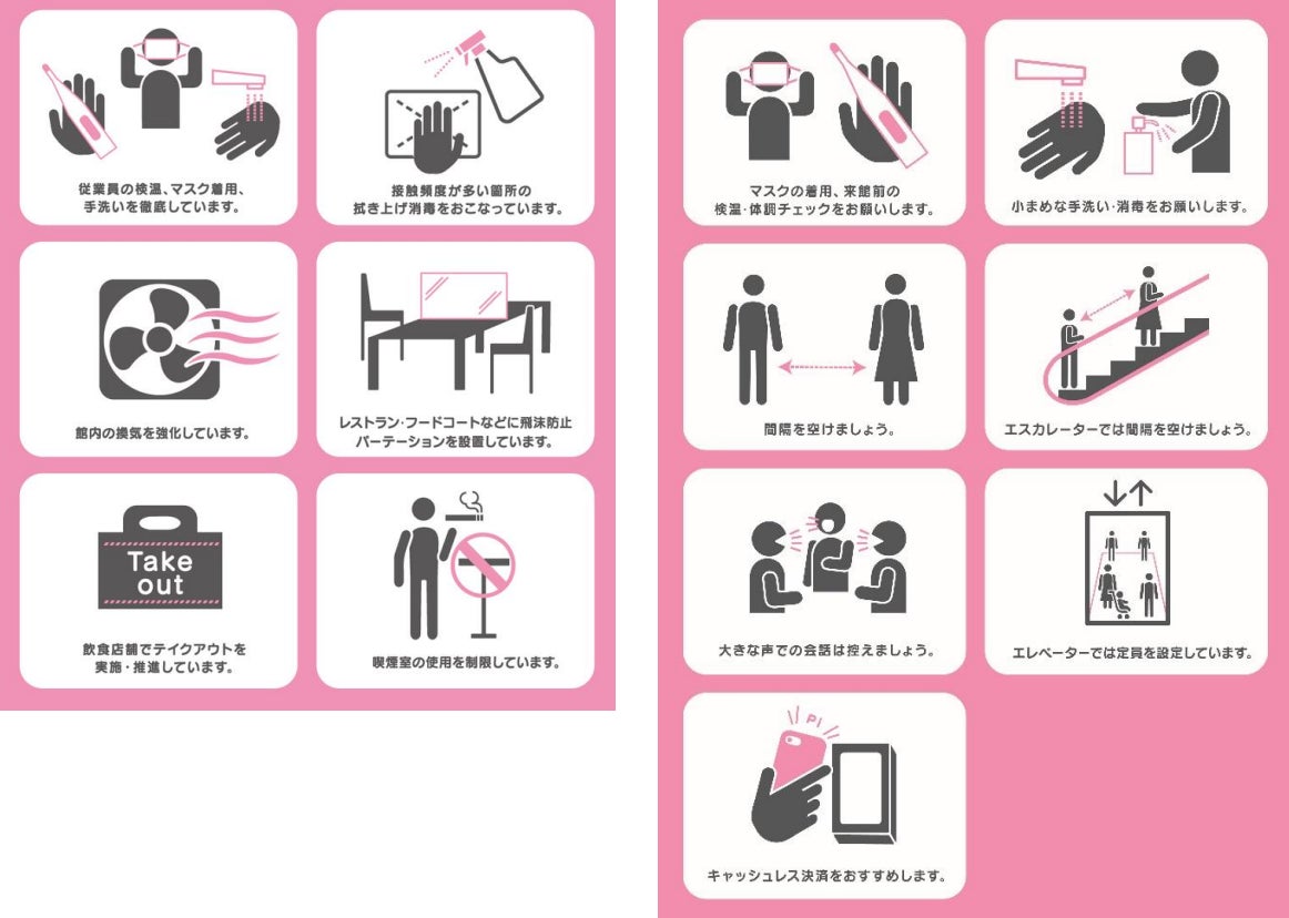 三井不動産グループが運営する商業施設では、新型コロナウイルス感染拡大防止のため、下記をはじめとした様々な取り組みを実施しております。