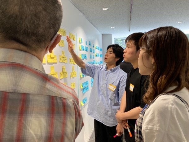 NTTデータCCSのビジネス開発チームと、京都精華大学メディア表現学部との共創がスタートしたのは2023年6月です。現在、芸大生が作品を発信する日常的なツールは何が多いのか、芸大生は自分の作品を果たして発信したいと思っているのかというユーザーニーズを探るため、メディア表現学部学生がそれぞれ芸術、デザイン、マンガ学部の学生にインタビューを行い、そこから得たキーワードをポストイットにデータとして書き出して、企業様とのワークショップを7月初旬に行いました。抽出されたキーワードは、壁一面を覆うボリュームになりました。