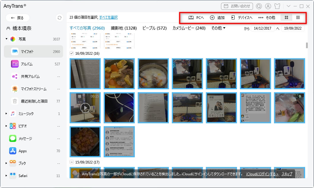 - iPhoneの写真、動画などをカテゴリに転送・追加できる