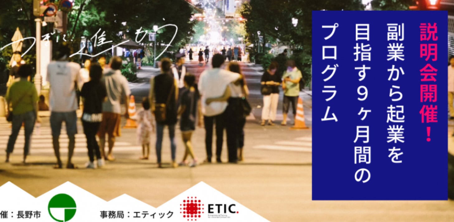 NPO法人 ETIC.(エティック、東京都渋谷区)は、長野県長野市の委託を受けて、長野市内の企業へ首都圏の副業人材をマッチングするプログラム、「NAGA KNOCK!(ナガノック)」を開始、副業人材を募集します。本事業は昨年度から実施し、今年で2期目です。初年度は、2名が登記しました。参加者募集の一環として、6月9日(木),16日(木)22日(水)に、プログラム説明会をオンラインで開催します。16日(木)の回には、登記した2名の1期生起業家をゲストに迎えます。