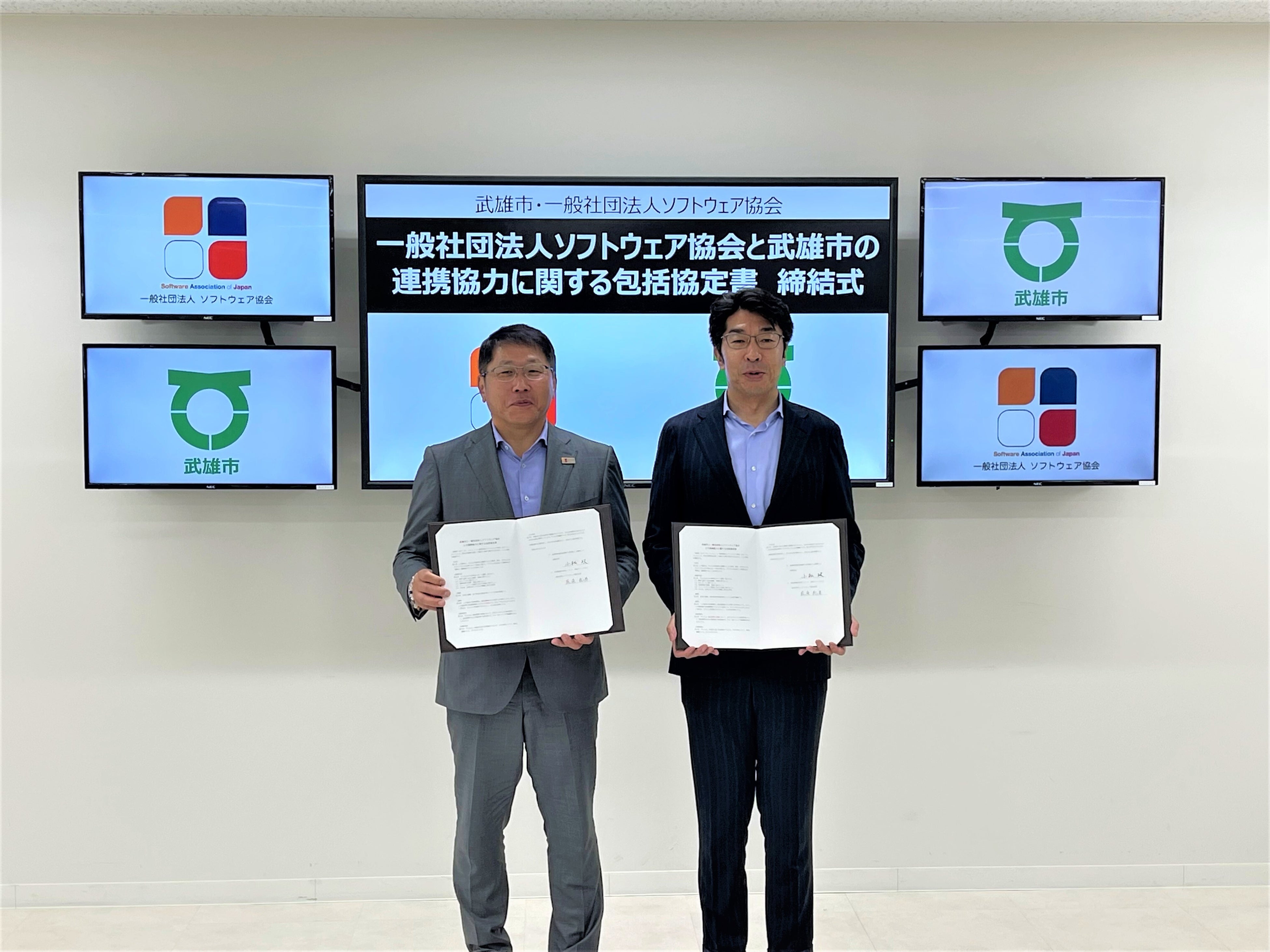 そこで、「ソフトウェア(国)の未来を創る」をビジョンに掲げるSAJとSAJ会員企業のノウハウ・実績を活用することによって、武雄市の教育、福祉、文化、まちづくり等、さまざまな分野でデジタル化を推進し、スマートシティ化の実現と、地域課題の解決を目的とし、協定を締結するに至りました。