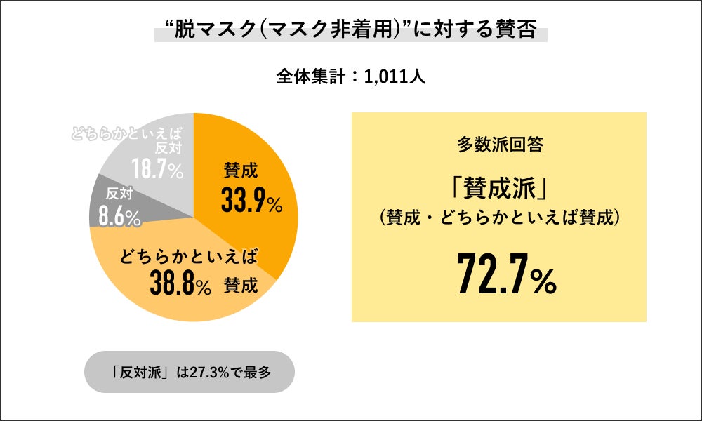 脱マスク(マスク非着用)に対する賛否では、「賛成」33.9%、「どちらかといえば賛成」38.8%を合算した72.7%が賛成派の回答をしました。反対派の回答は27.3%で、内訳は「反対」8.6%、「どちらかといえば反対」が18.7%でした。