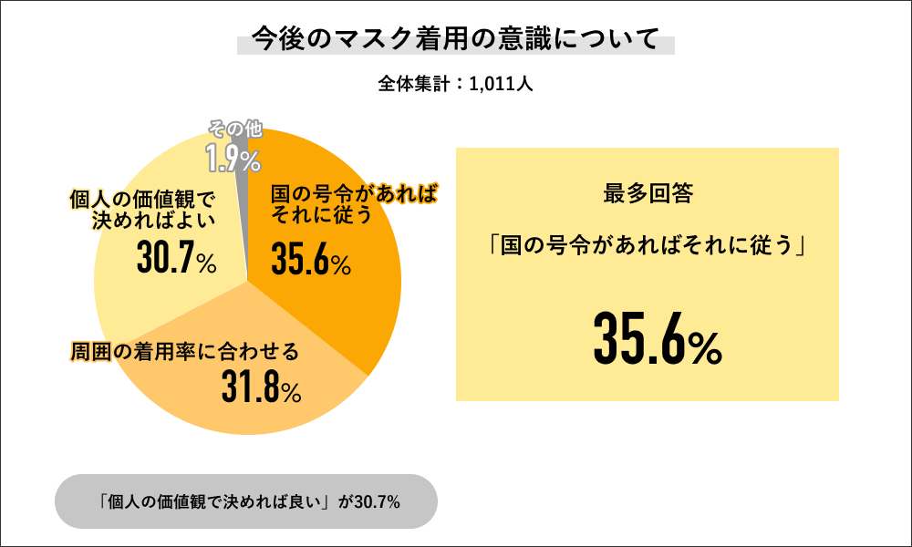 今後のマスク着用意識については「国の号令があればそれに従う」が35.6%で最多になり、次いで「周囲の着用率に合わせる」が31.8%、「個人の価値観で決めれば良い」が30.7%の結果になりました。