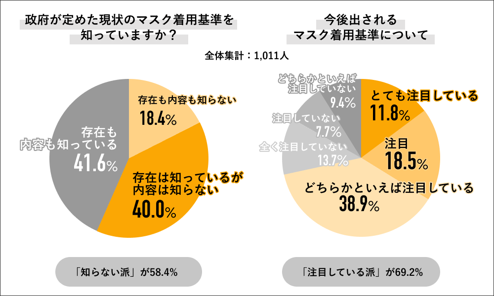 また現在見直されているマスク着用基準の注目度は「とても注目している」11.8%、「注目している」18.5%、「どちらかといえば注目している」38.9%を合算した69.2%が”注目している派”の回答をしました。”注目していない派”の回答は30.8%で、内訳は「全く注目していない」13.7%、「注目していない」7.7%、「どちらかといえば注目していない」9.4%でした。