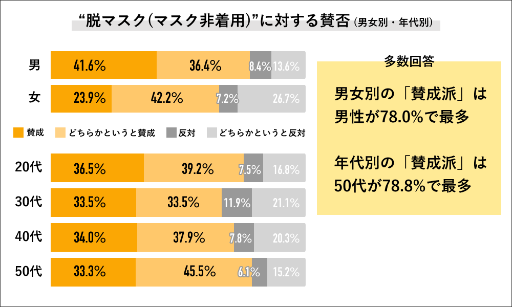 また「賛成派」の回答を”男女別”で見ていくと男性の回答が78.0%に対して女性の回答は66.1%になり、脱マスク賛成派の回答は男性の方が11.9ポイント多い結果になりました。さらに”年代別”で「賛成派」の回答を見ると20代が75.7%で30代が67.0%、40代が71.9%、50代が78.8%になり、脱マスク賛成派の回答は50代が最も高い結果になりました。
