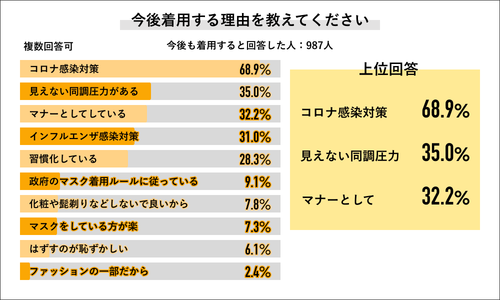 今後もマスクを着用すると回答した987人に対してその理由を聞くと、「コロナ感染対策」が68.9%で最多回答になり、次いで「見えない同調圧力があるから」が35.0%、「すでにマナー化しているから」32.2%、「インフルエンザ感染対策」31.0%、「習慣化しているから」28.3%で上位5つの回答結果になりました。
