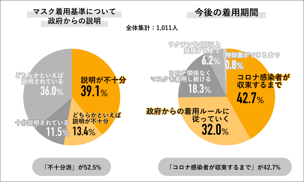一方今年5月に政府が表明している現状のマスク着用基準の認知度では、6割が「内容を知らない」といった回答結果で、半数以上がマスク着用に対して「政府の説明が不十分」と回答していることから、新たに見直されるマスク着用基準も、国民への十分な説明と周知がなされない限り、現状からさほど変化が見られない結果を産んでしまうことも予測できます。
