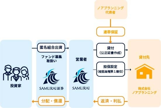 不動産担保付きローンとは、土地や建物などの不動産を担保にして銀行やその他の金融機関等から融資を受けることをいいます。本匿名組合では営業者であるSAMURAI ASSET FINANCE株式会社(以下、「営業者」)が、株式会社ノアプランニング(以下、「貸付先」)に対して実行した1億8,000万円の貸付(以下、「本件貸付」)に対するバックファイナンスをおこないます。