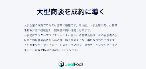 「エンタープライズセールステック DealPods」について、弊社事業責任者の中谷が30分ほどでご説明をするオンラインセミナーを2024年1月24日(水)〜2024年1月31日(水)のうち、4日程ほど放映致しますので、ご興味をお持ちの方は以下のURLからご視聴のお申し込みをくださいませ。