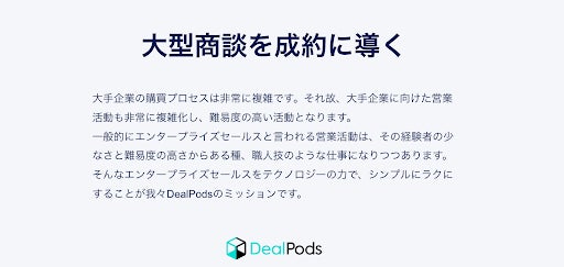 デジタルセールスルームの活用により顧客にパーソナライズされた体験を提供することで営業と顧客の関係性は向上し、商談情報を顧客のためにまとめて共有することで顧客社内合意失敗リスクを低減し、複雑な購買プロセスを支援することで大型商談の失注リスクを低減します。購買者の支援のみならず、営業パーソンの作業工数を削減することによって営業成果を向上させる、画期的なセールステックツール「DealPods」をぜひご利用ください