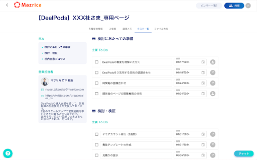 DealPodsでは、顧客とデジタルセールスルーム上でタスクを共有するだけでなく、各タスクに期日を設定し、担当者をアサインした後、期日が近づくと自動でリマインドを送付することが可能です。この新機能により、営業担当者はネクストアクションを設定した後に毎回の確認連絡を行う手間を大幅に削減できます。タスクの進捗や期限の把握が簡単になり、エンタープライズセールスの案件がスムーズかつ効率的に進むことが期待されます。