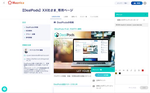 DealPodsでは、デジタルセールスルーム上に顧客が簡単にアクセスできるようになっており、アクセスした方には直接ダイレクトメッセージが可能です。この機能により、直接接点のないキーパーソンともデジタル上でコミュニケーションを取ることが可能となります。ダイレクトメッセージ機能は、顧客社内での紹介・手紙でのアプローチに次ぐ第三の打ち手として、直接キーパーソンと対話できる画期的な手段です。これにより、キーパーソンとの接触率を向上させ、エンタープライズセールスの成功率を大幅に向上させることが期待できます。