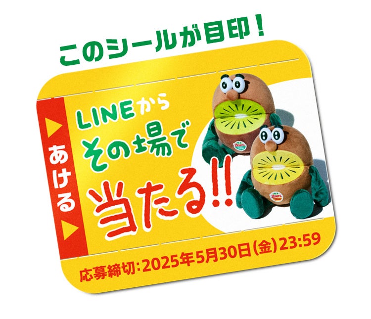 キウイフルーツには、ビタミンCや食物繊維など、日常生活で積極的にとりいれたい10種の栄養素がたっぷり。パッケージに貼られたキャンペーンシールで栄養クイズに答えて応募すると、大当たり賞 キウイブラザーズ【グリーン】または【ゴールド】の中サイズぬいぐるみ1体がそれぞれ1,000名様、合計2,000名様に当たります。落選しても、LINEで友だちにキャンペーンをシェアすることでダブルチャンス賞への応募が可能に。キウイブラザーズ【グリーン】または【ゴールド】の小サイズぬいぐるみ1体がそれぞれ500名様、合計1,000名様に当たります。