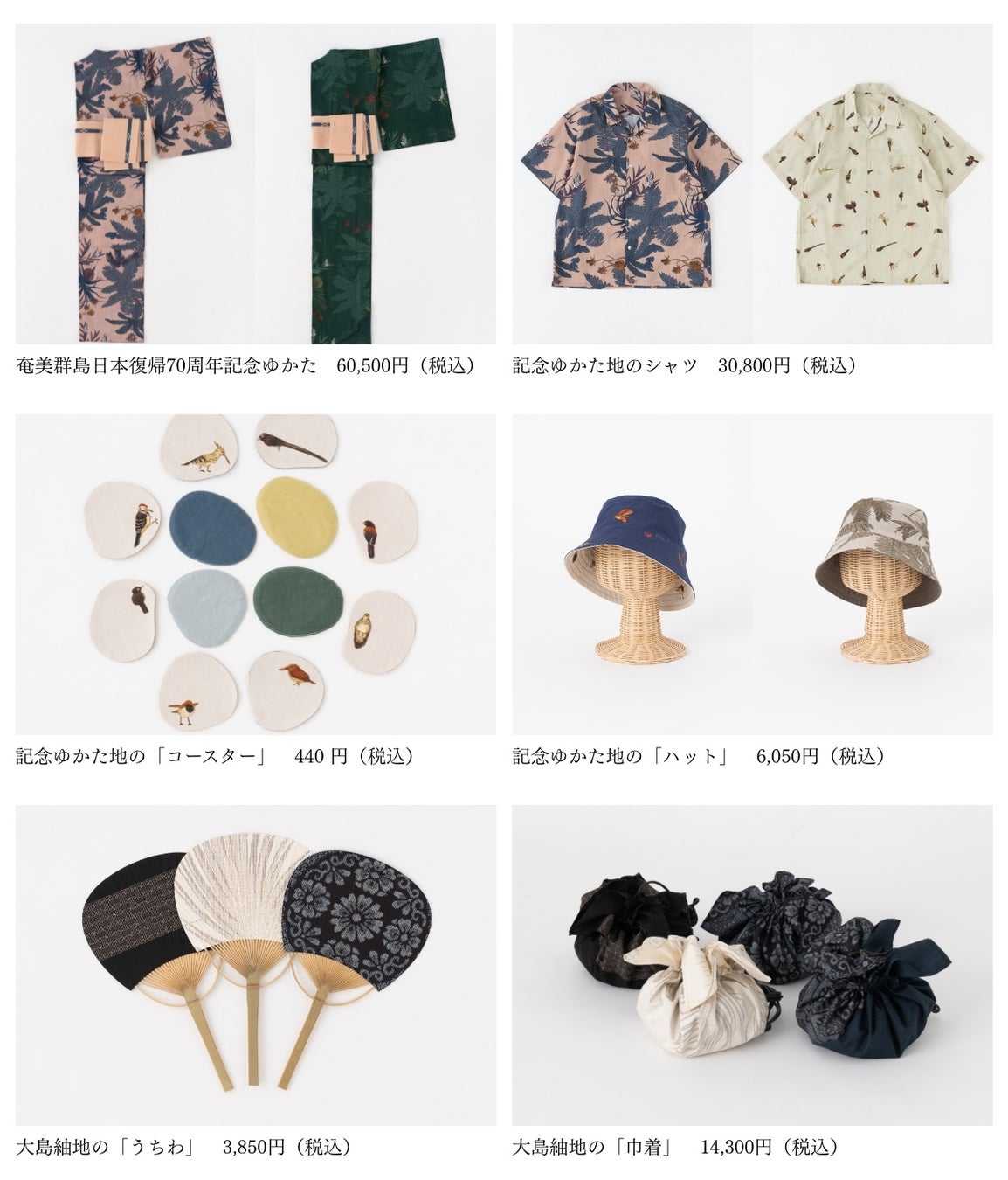 会場ではきものやまとオリジナルの「本場奄美大島紬」をはじめ、日本復帰70周年を記念して製作したデザインのゆかたやシャツ、手ぬぐい、帽子、エコバック、コースターを展開いたします。この限定デザインは奄美大島の鳥や自然をモチーフとして豊かな自然を感じられるアイテムとなっており、売上の一部を奄美群島の自然保護に役立てるため、奄美群島広域事務組合への寄付を予定しています。