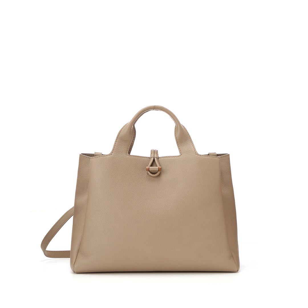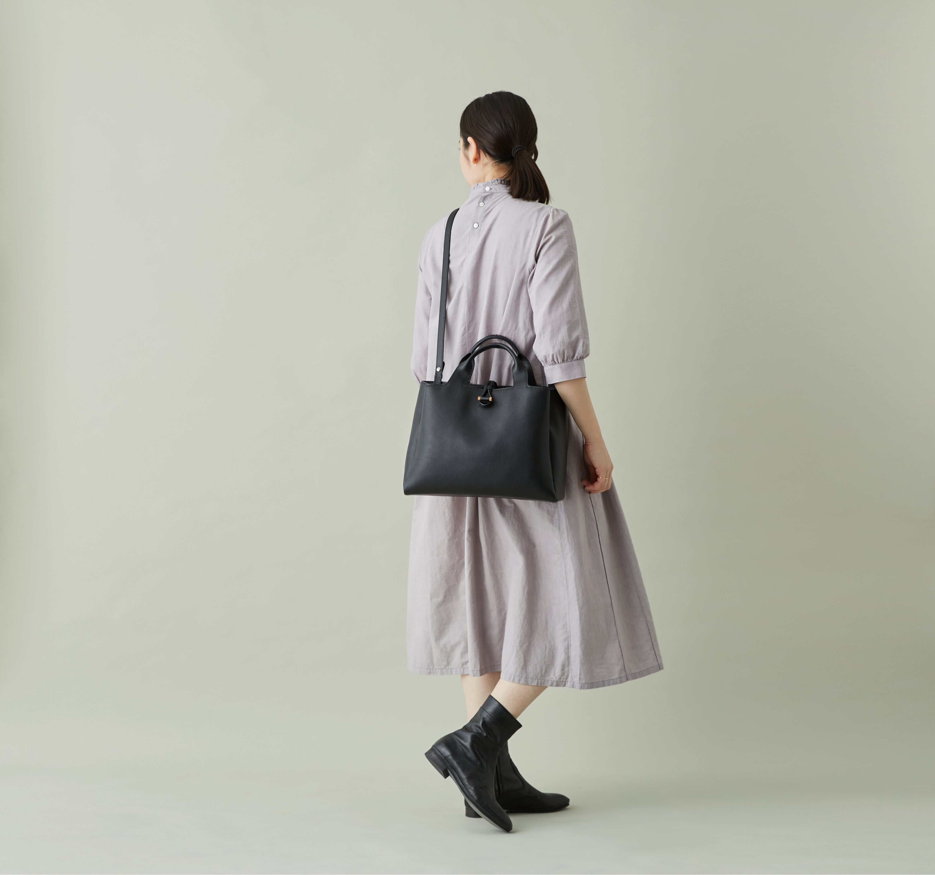 「Sou 2 Way Tote」は、13インチ程度のPCが収納できる容量を持ちながらも、前から後ろ側にかけて広がるようなフォルムにすることで、すっきりとした佇まいを演出。前後で生まれる絶妙な差異が、大きく見えがちなバッグをスマートに見せ、小柄な女性でも持ちやすいデザインに仕上がっています。柔らかなレザーが醸し出す軽やかな印象は、オフスタイルにもマッチ。オンオフ兼用で、持つ人の日常に寄り添います。