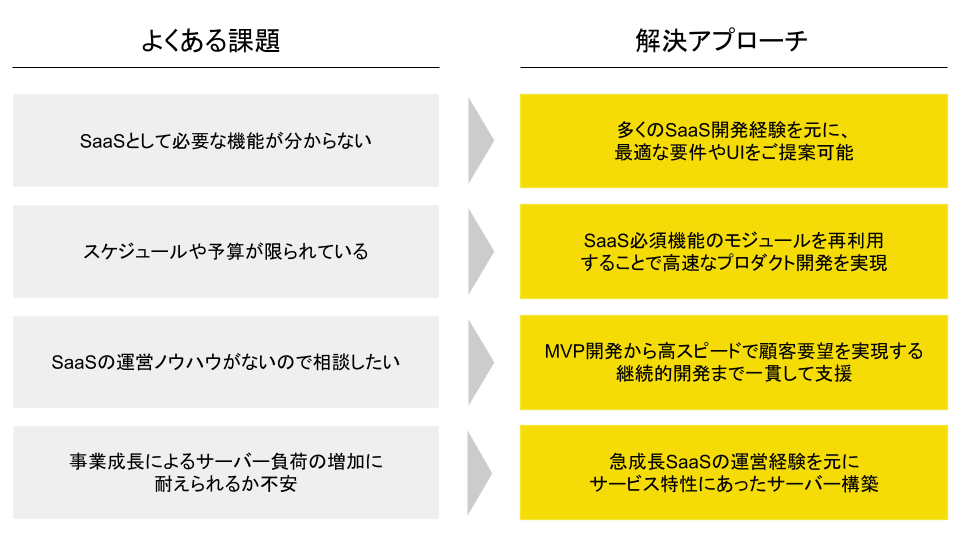 エンジニア/デザイナーによる支援だけではなく、複数のSaaS事業を国内シェアNo.1まで拡大させたグロースのプロフェッショナル集団が事業成長に伴走することも可能です。単にプロダクトを提供して終わりではなく、その後のスケールアップまで一貫して伴走します。