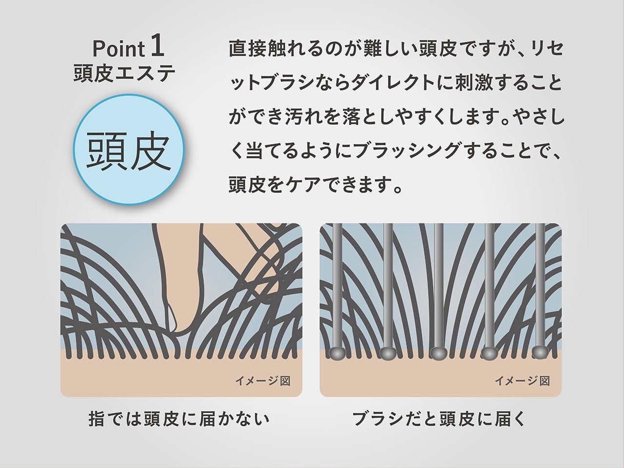 直接触れるのが難しい頭皮ですが、リセットブラシならダイレクトに刺激することができ、汚れを落としやすくします。やさしく当てるようにブラッシングすることで頭皮をケアできます。