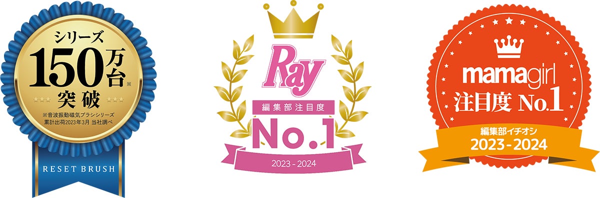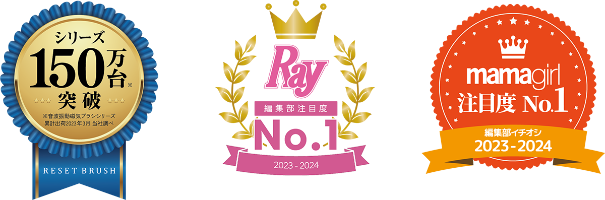 音波振動磁気ブラシシリーズはおかげさまで150万台突破。また、365日可愛くなりたい女の子のための情報をリアルタイムでお知らするファッション誌『Ray』より、編集部注目度№1と、ママに向けたファッションやビューティコンテンツのほか、子育てやエンタメ情報なども満載のWEBマガジン『mamagirl』より、編集部注目度№1の称号を取得!