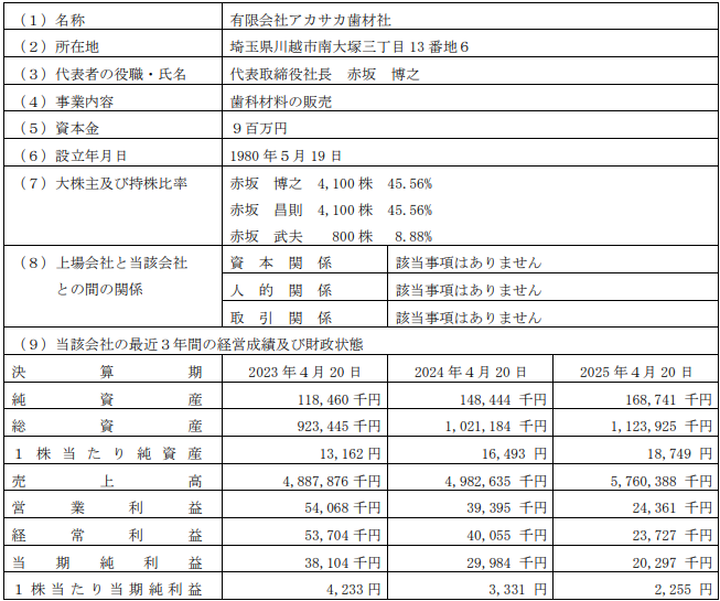 本持分取得により、アカサカ歯材社は 2027年3月期第2四半期から当社の連結子会社となる予定であります。本持分取得に伴う当社の 2026年3月期の業績および財務状況に与える影響につきましては精査中であり、今後公表すべき事項が生じた場合には、速やかにお知らせいたします。