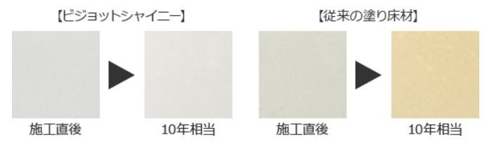 主成分となるエポキシ樹脂は、一般的に紫外線の影響により黄変しやすいという欠点がありますが、ビジョットシャイニーに使用しているエポキシ樹脂系クリアコートは、特殊な配合により黄変しにくいため、長期にわたり美しさを保持できます。また、厚さは、コンクリートの上に約1㎜で仕上げることができ、施工後に段差を気にする必要はありません。新築だけでなく、改修にも適しています。