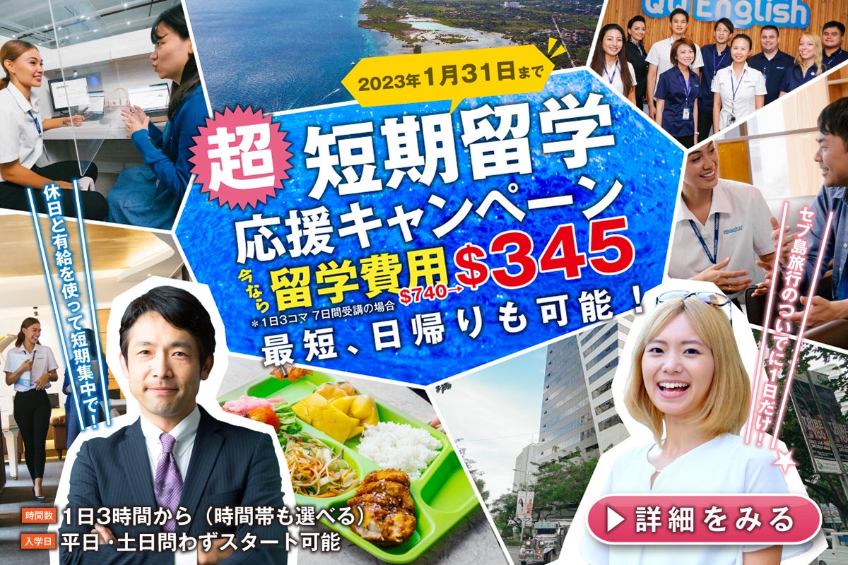 株式会社QQEnglish (本社:東京都渋谷区、代表取締役:藤岡 頼光)は、セブ島留学事業において、2022年11月16日(水)から2023年1月31日(火)まで最短日帰りも可能な超短期留学キャンペーンを開始します。