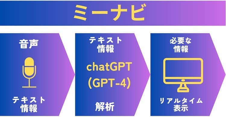 音声を高精度に認識してテキスト情報に変換します。そのテキスト情報をChatGPT(GPT-4)に入力し、会議を最適化するための必要なデータ形式に変換します。そして、リアルタイムで会議データを出力します。