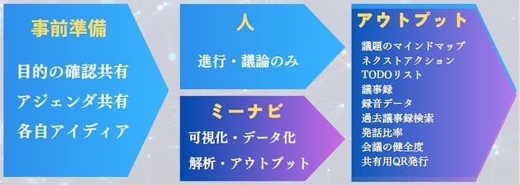 ミーナビは従来会議のファシリテーターが負っていた様々な機能を代替します。